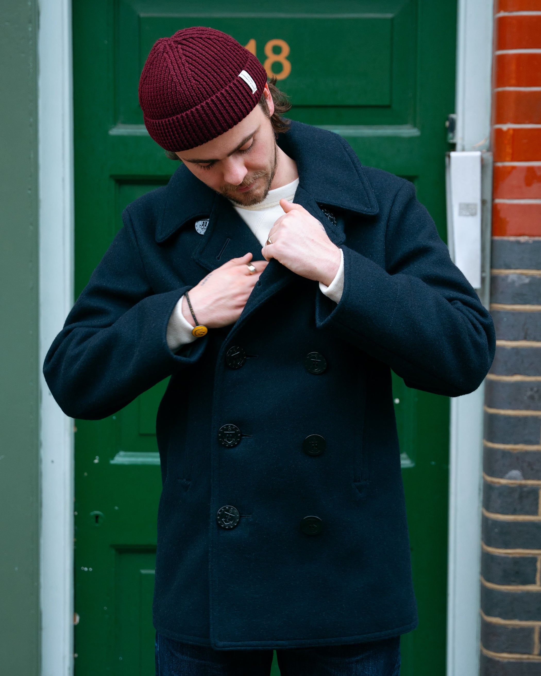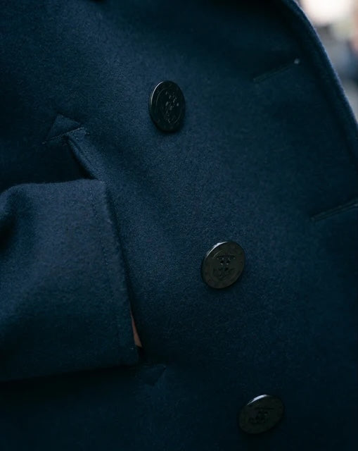 During the First World War, the jacket of choice for the Navy was another style now renowned in menswear - the Peacoat. Recognisable for its longer cut and woollen construction, the jacket was used by the Dutch as early as the 1800s and popularised by the British Army, who constructed theirs from tightly woven melton wool to combat the freezing winds at sea. The jackets were used extensively through WWI, with a tight waist and flaring around the hips making them warm yet moveable. Though issued by the US Navy until 2020, the Peacoat fell out of style at the start of WWII, as it became clear a new jacket was needed for this conflict.